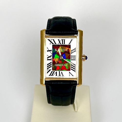 Ammolite Watch- Large-Roman Mosaic Rectangle Watch-Black Leather Strap (Korite)