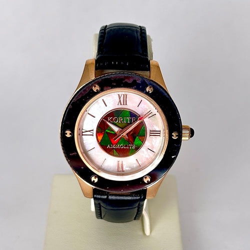 Ammolite Watch- Small-Mosaic Ammolite white Mother of Pearl 36mm Round Watch-Black Leather Strap (Korite)