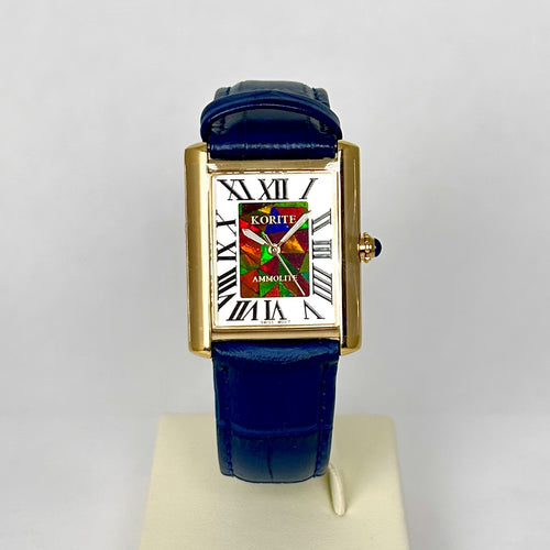 Ammolite Watch- Large-Roman Mosaic Rectangle Watch-Navy Blue Leather Strap (Korite)