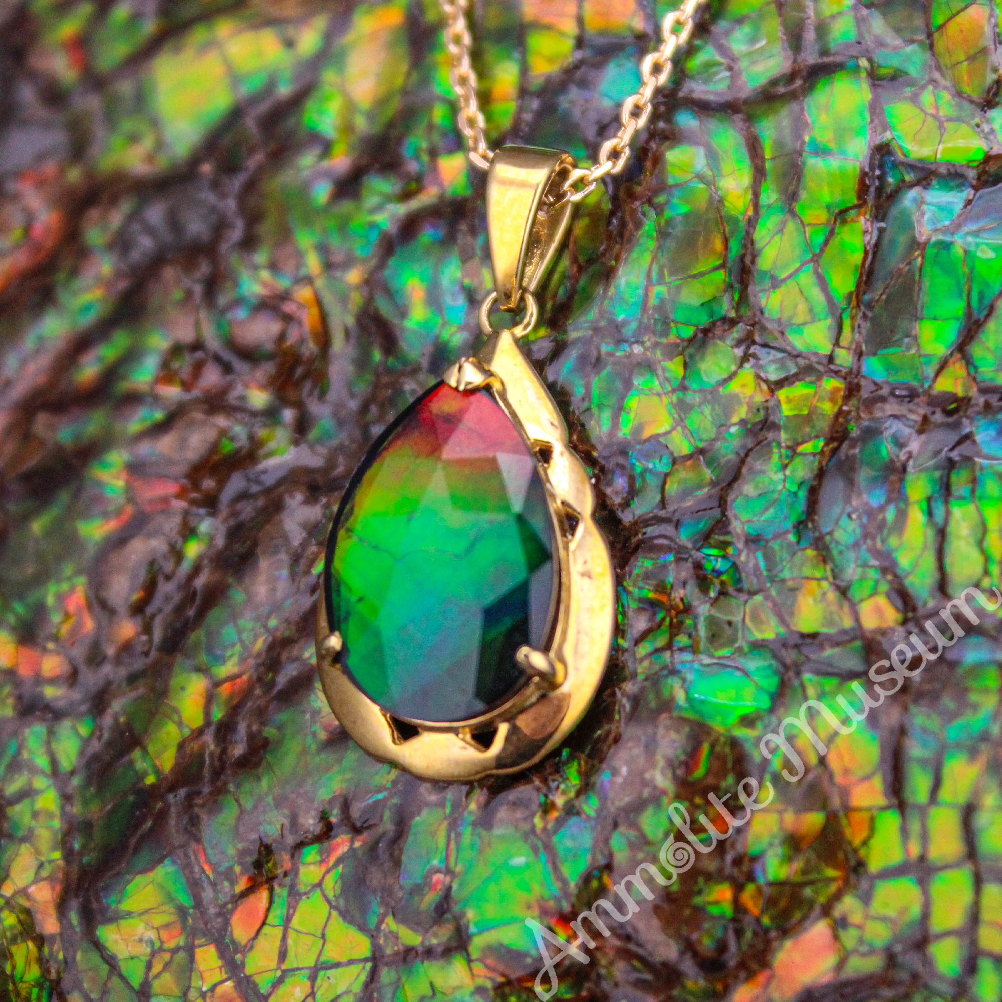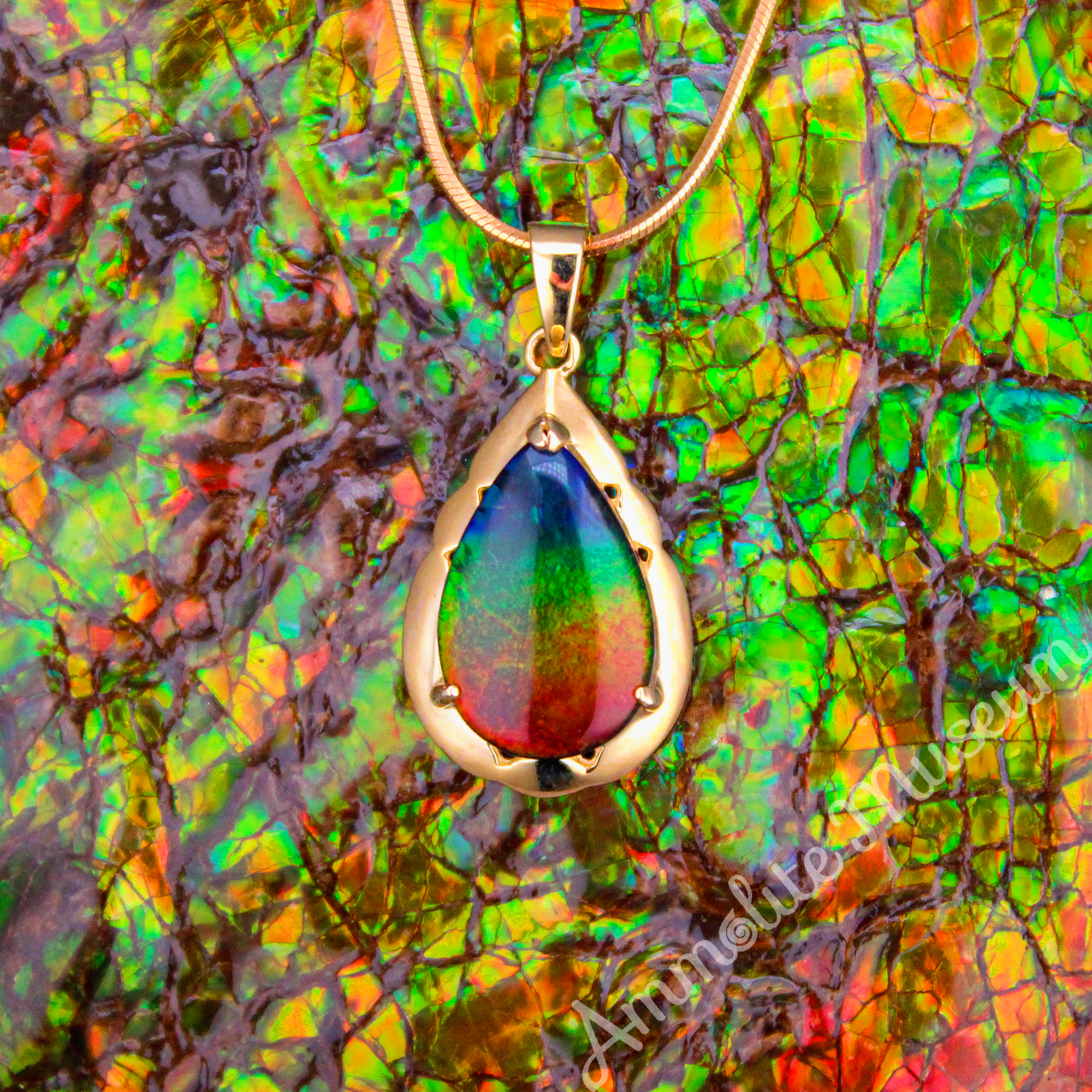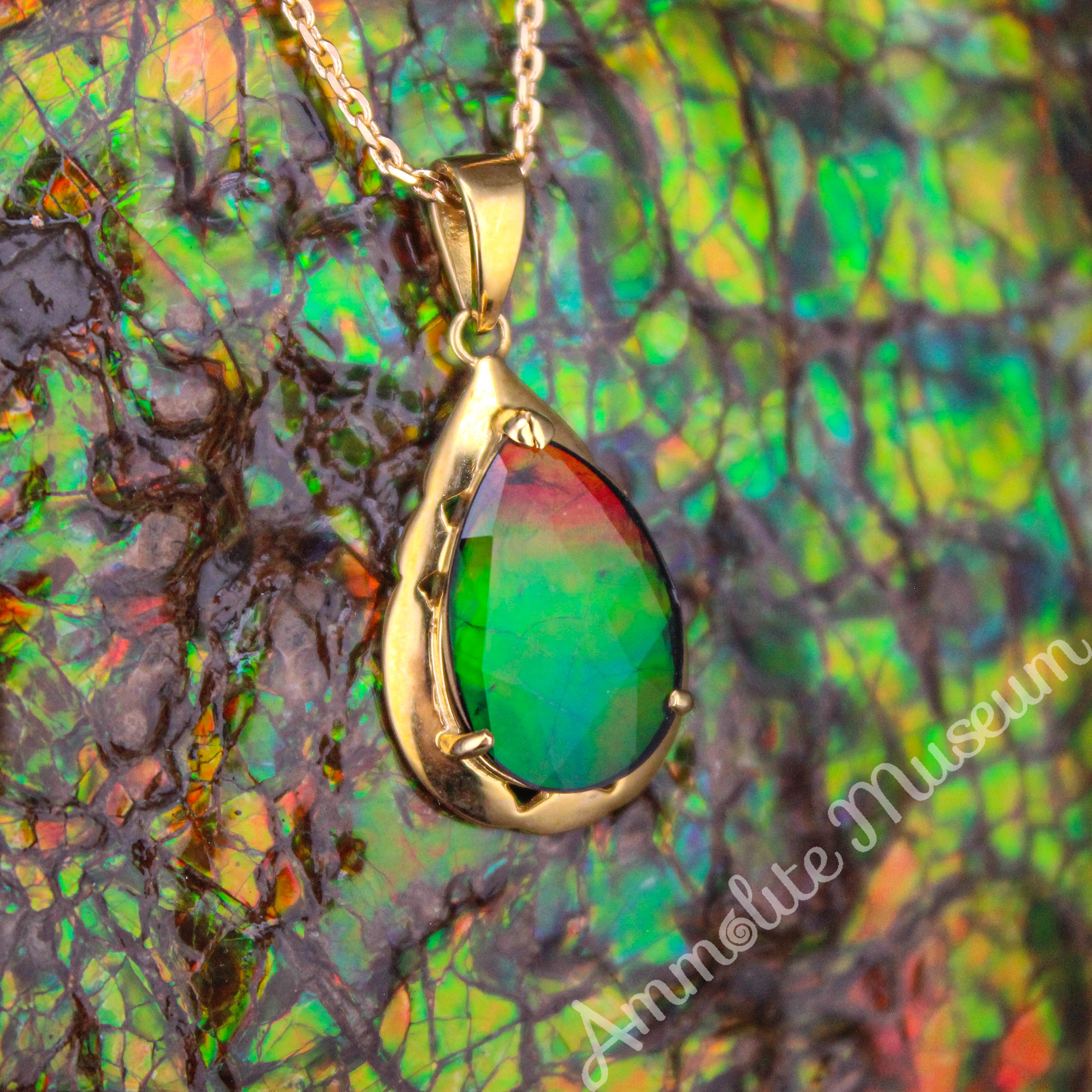 - Classic Teardrop Shaped Ammolite set in 14K Gold